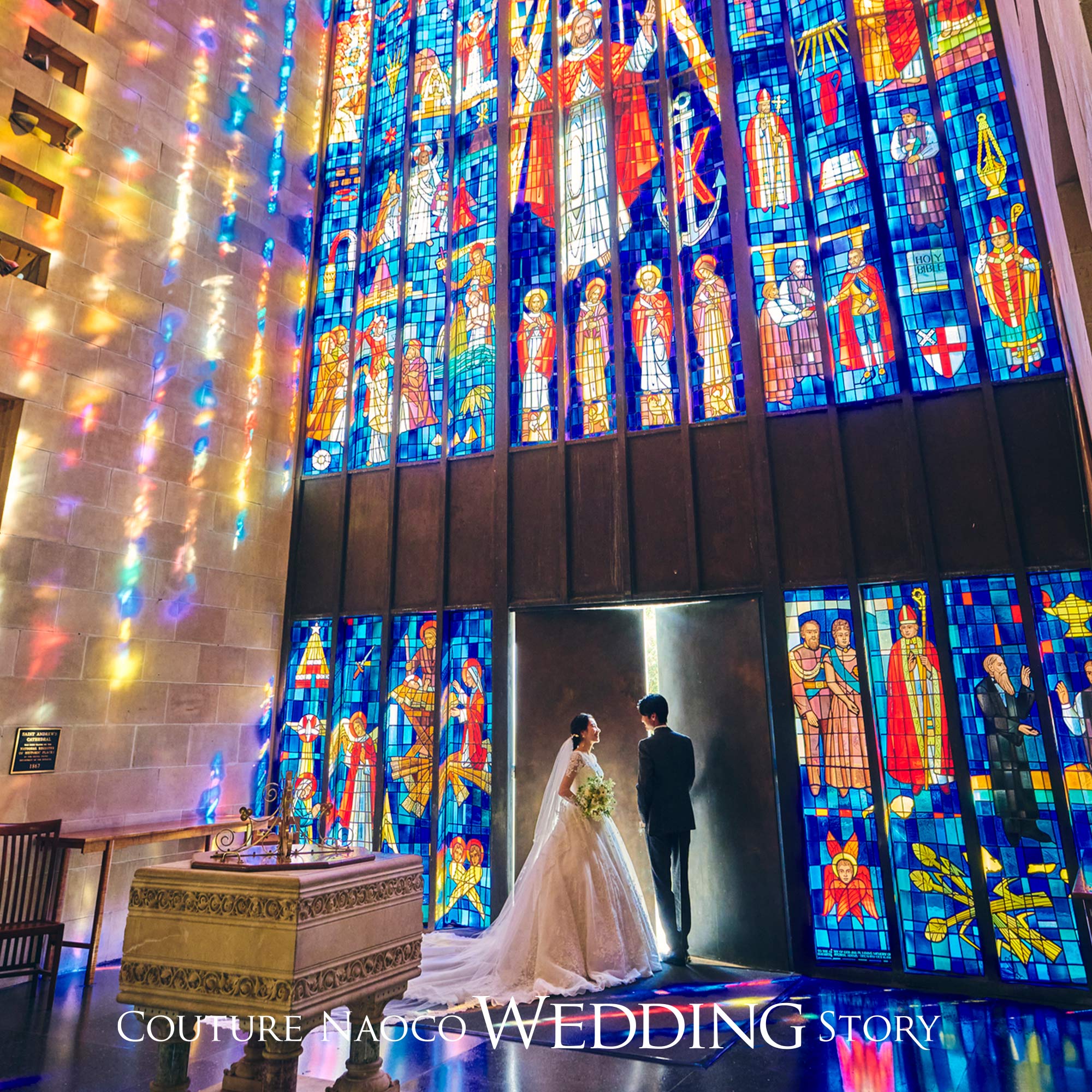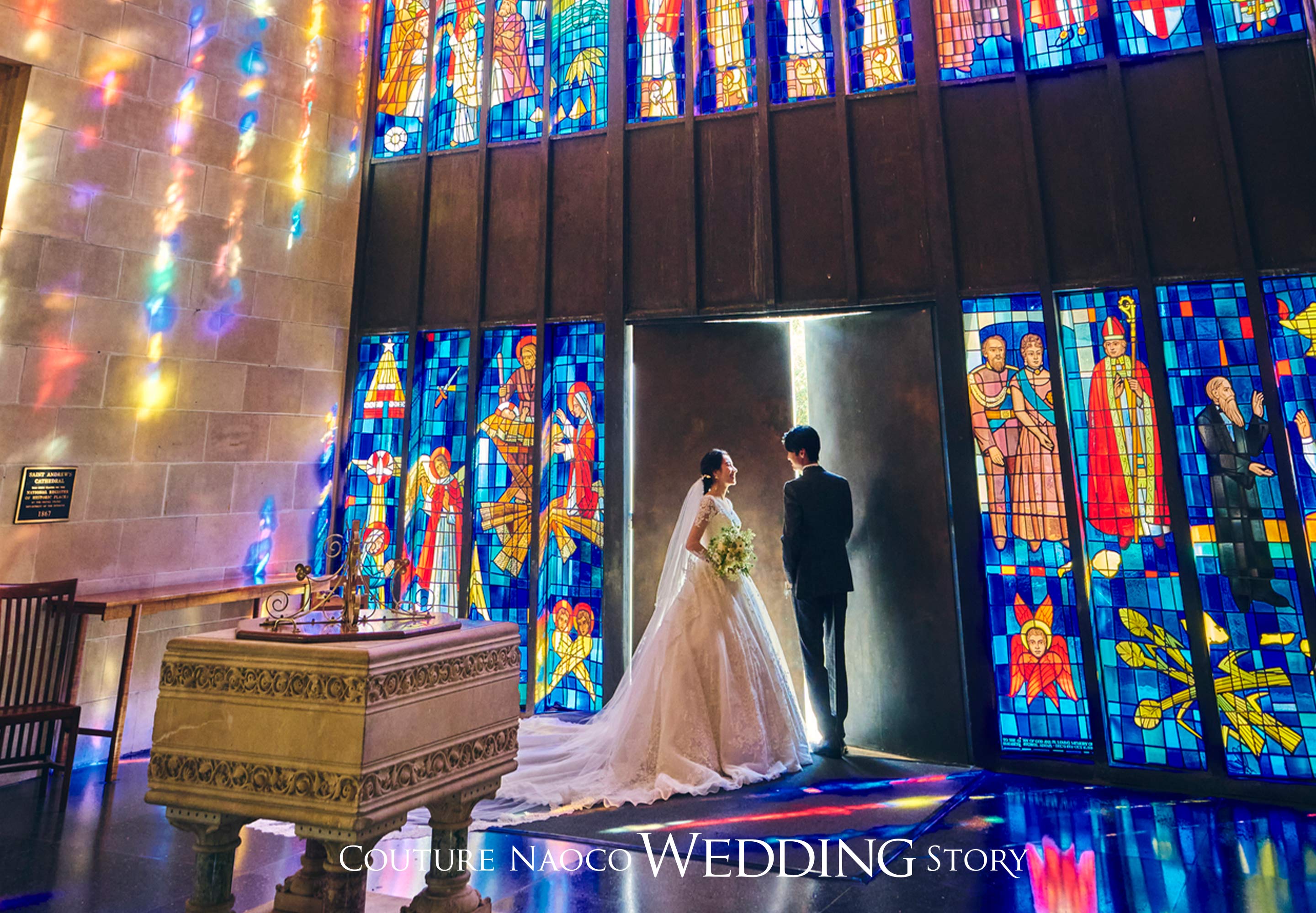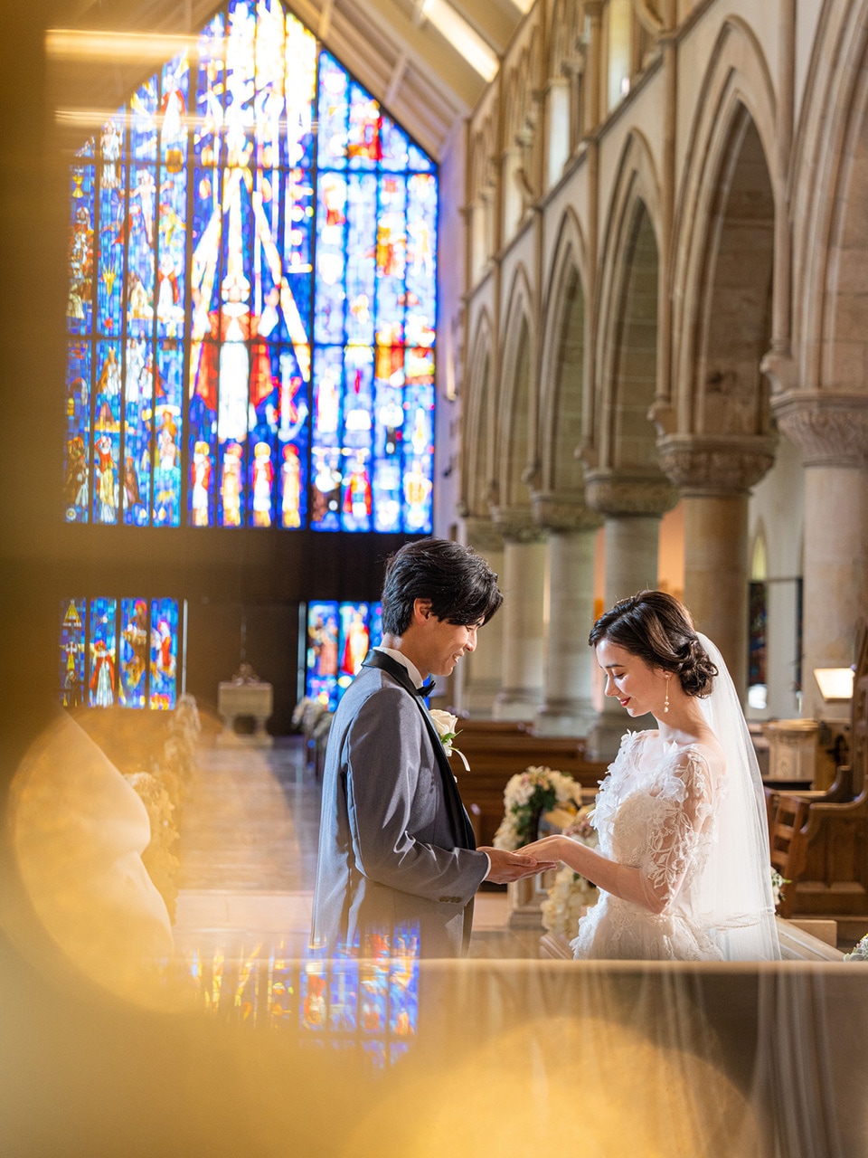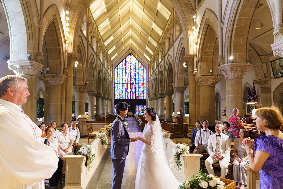 歴史あるハワイの教会でステンドグラスに見守られて厳かな挙式を。