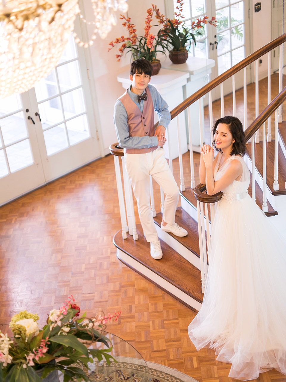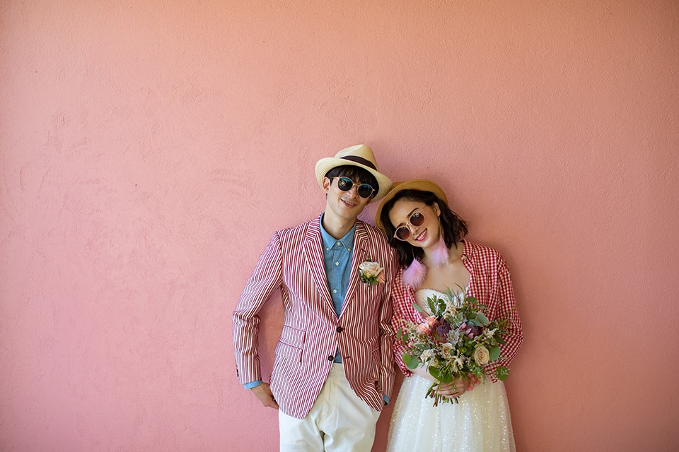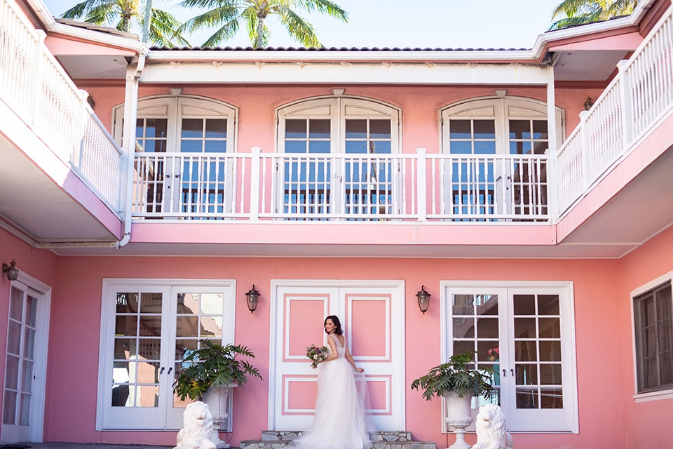 レトロな雰囲気のピンクのビーチハウス「ダ・ピンクハウス」はお気に入りのドレスを着て笑顔いっぱいの撮影を。螺旋階段やピンクのインテリアが並ぶ屋内、邸宅前に広がるガーデン&ビーチの写真も残せます。