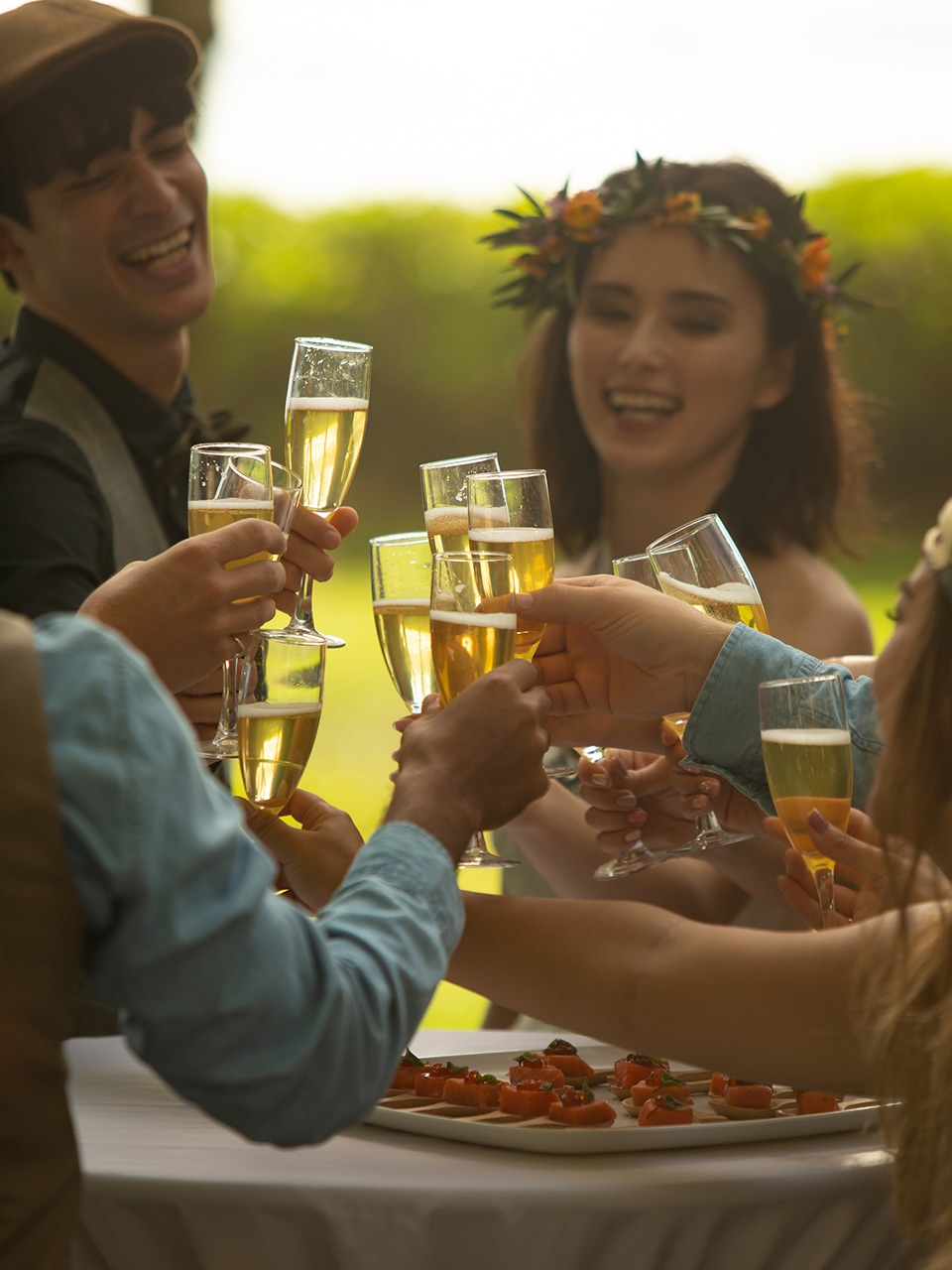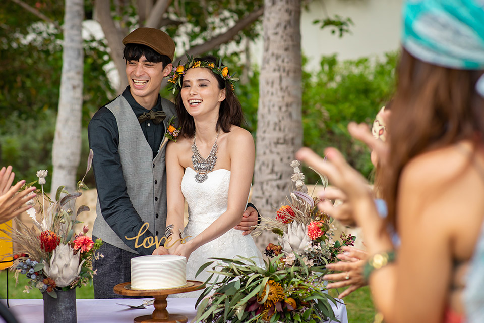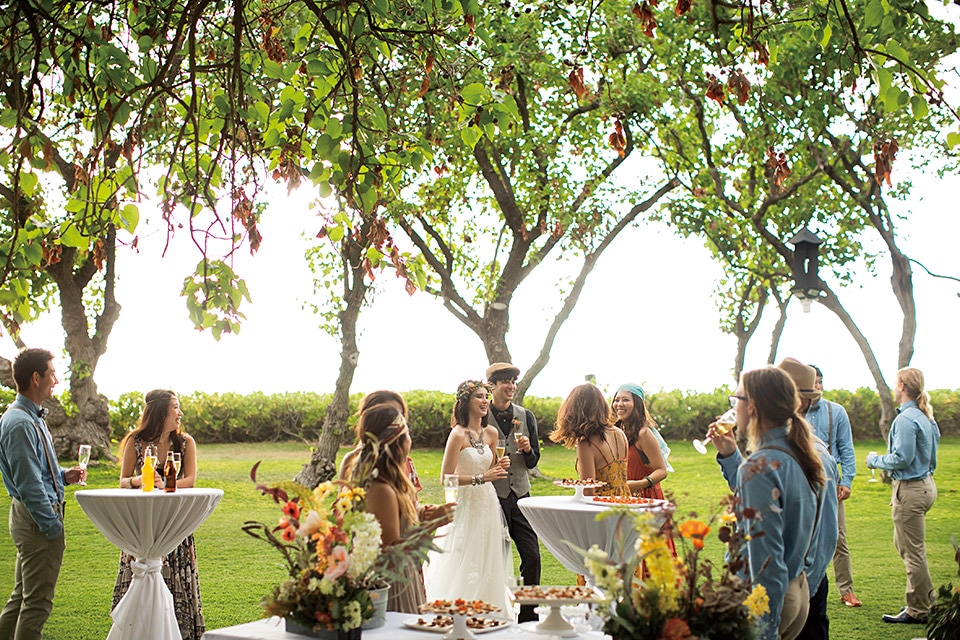 セレモニーの余韻をそのままに、ガーデンでのアフターパーティーへ。手軽なフィンガーフードを食し、ハワイの心地よい風を感じながらゲストとくつろぎの時間を。