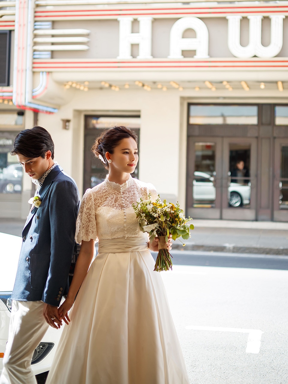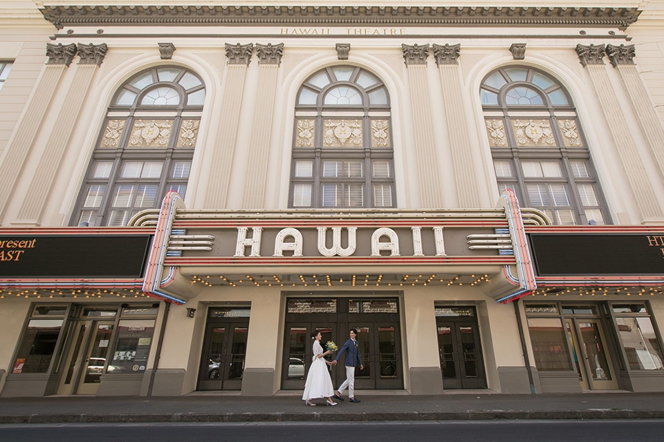 「Pride of Pacific」と呼ばれる美しいハワイシアター(劇場)をバックにした撮影はまるで映画のワンシーンのよう。クラシックな印象の写真が残せます。