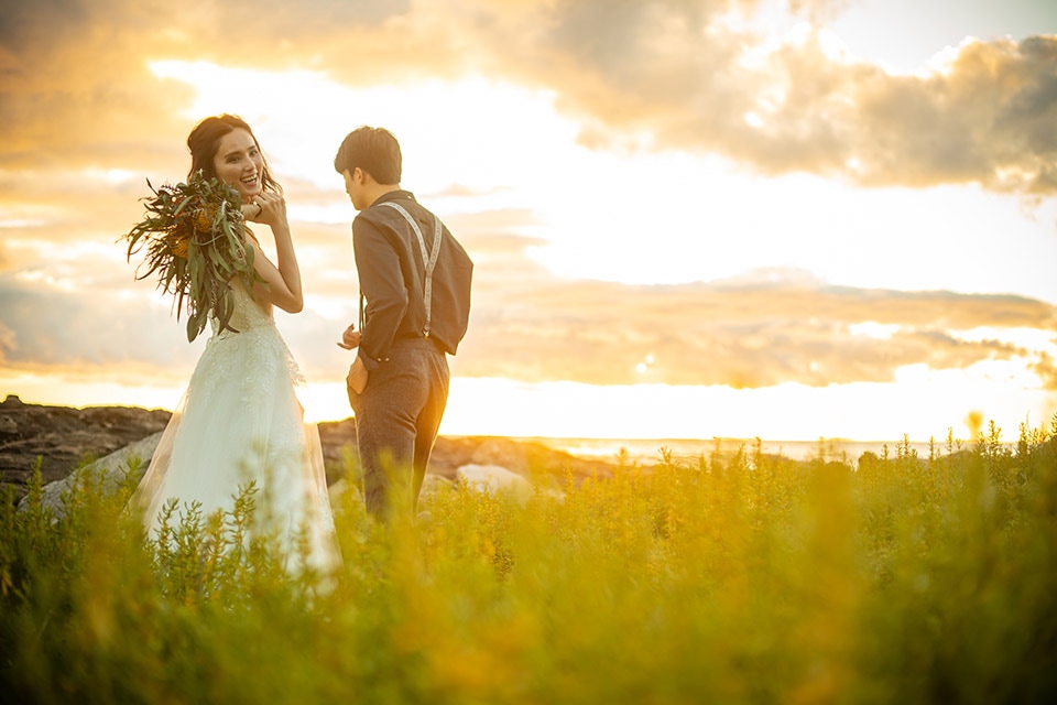 ガーデンの目の前に広がるビーチでサンセット撮影。落ち行く夕日はシャッターをきる度に表情を変え二人を輝かせてくれます。