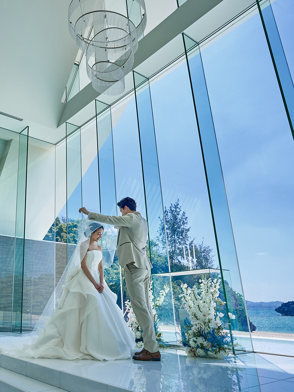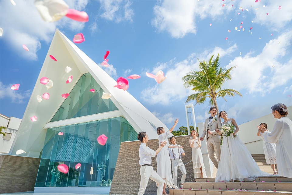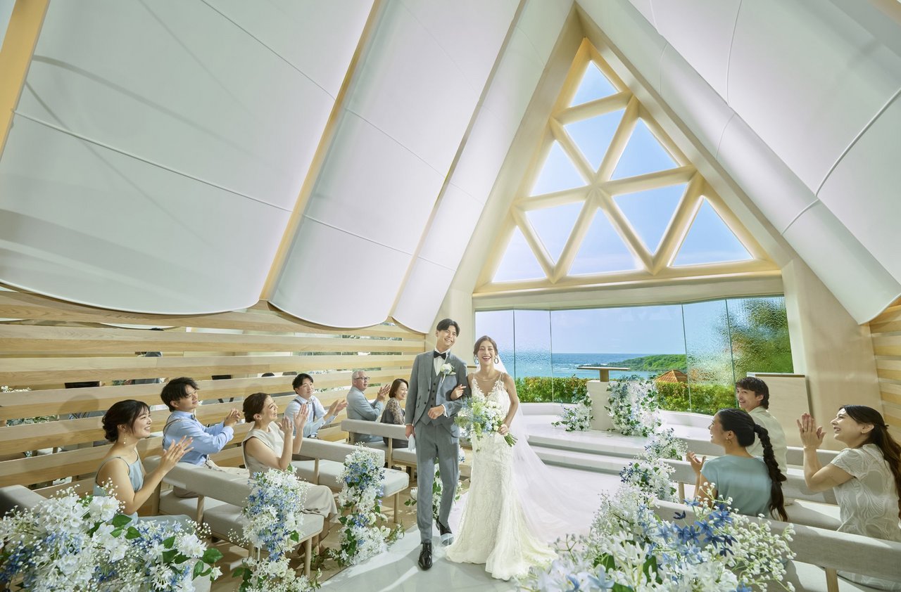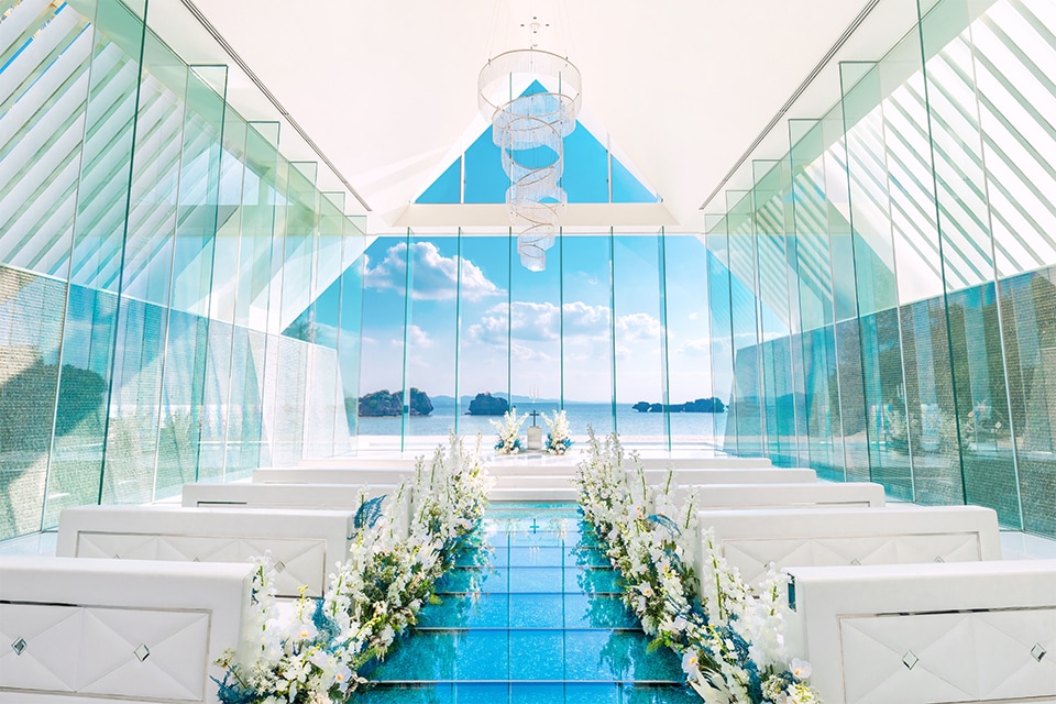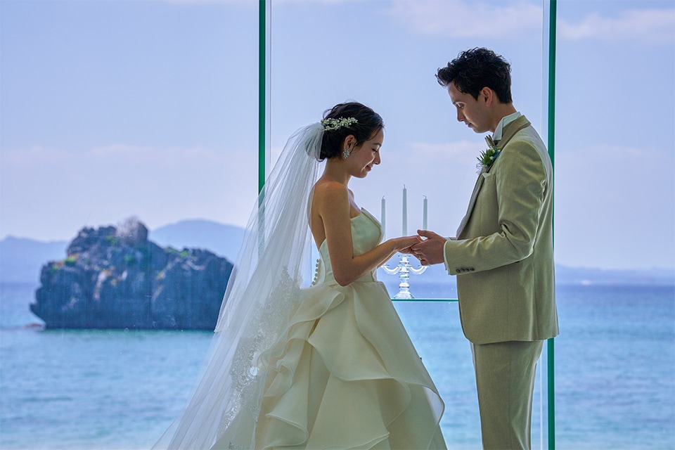 全面ガラス張りの洗練されたチャペル。会場に差し込む自然光がキラキラ美しく輝きます。ガラスのバージンロードを歩むと目の前には名護の海が広がるオーシャンフロント。理想が叶うこのチャペルでとっておきの挙式を。
