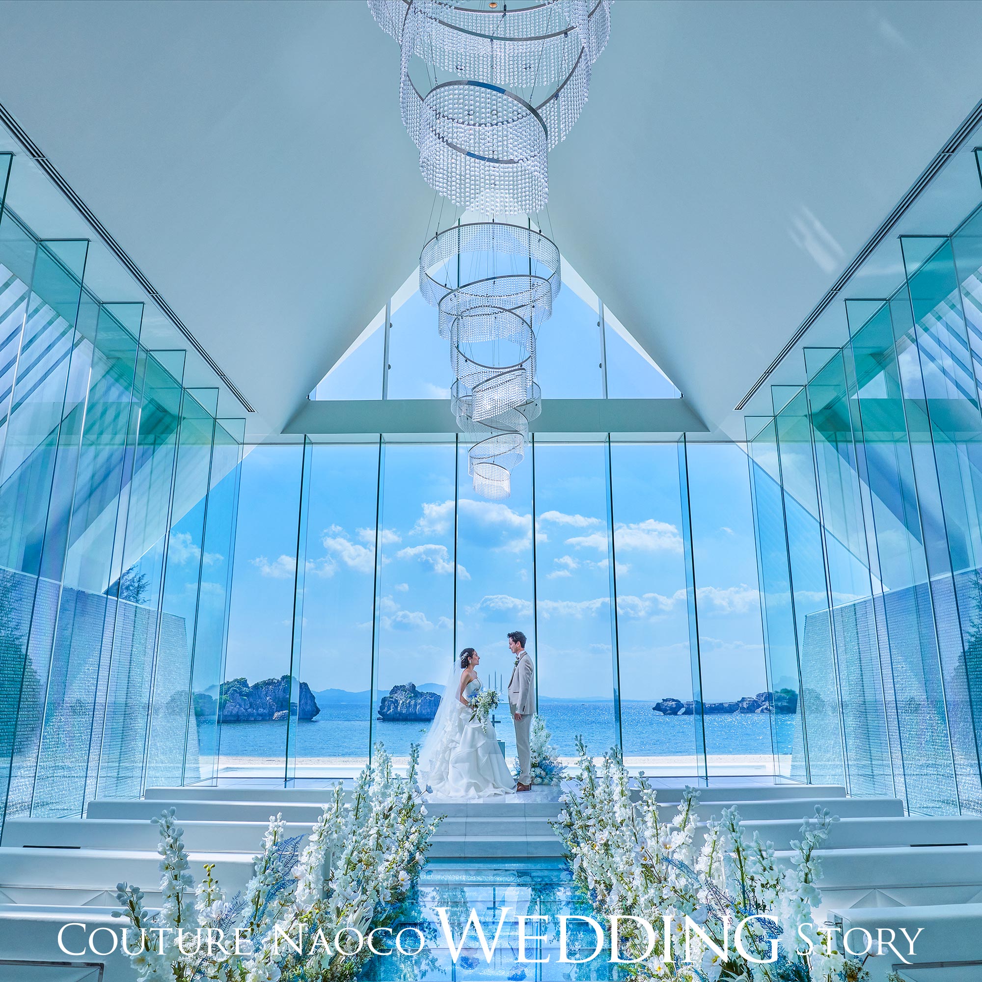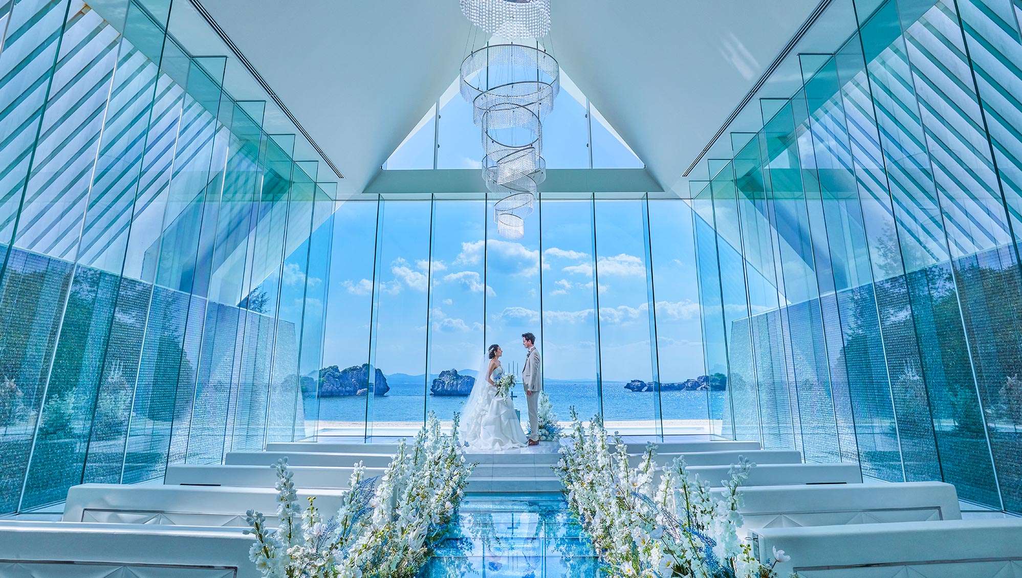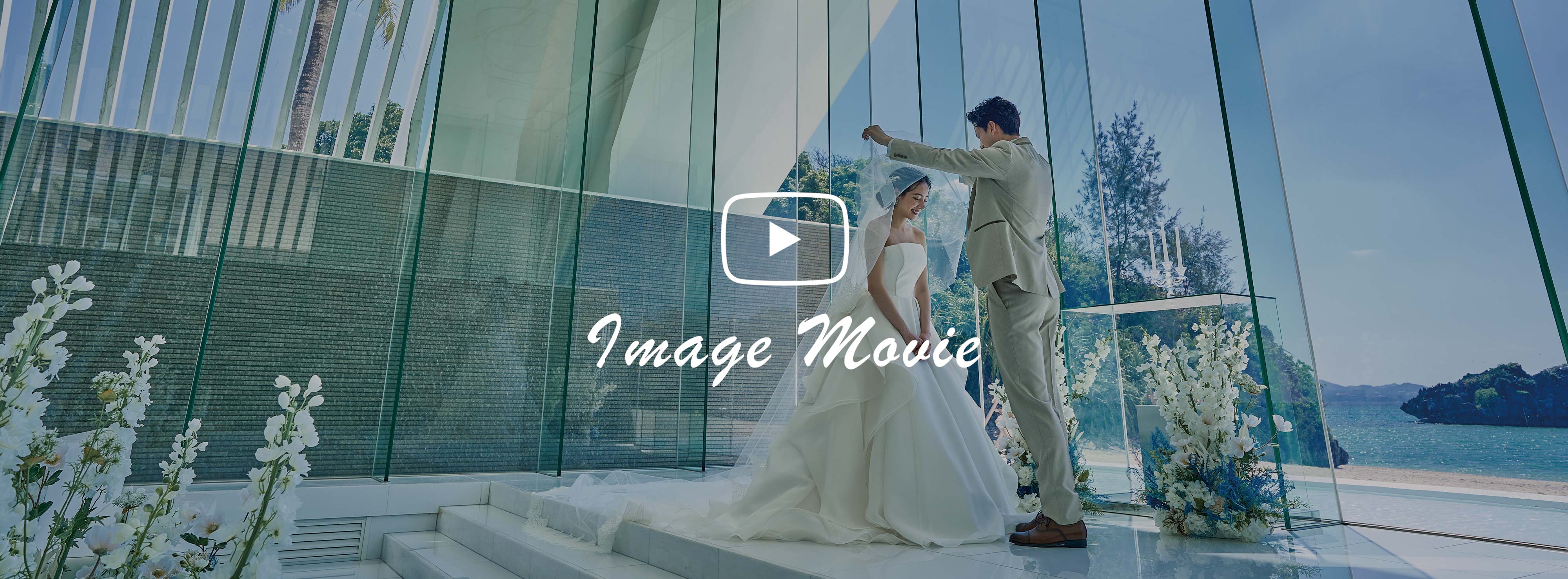 全面ガラス張りの洗練されたチャペル。会場に差し込む自然光がキラキラ美しく輝きます。ガラスのバージンロードを歩むと目の前には名護の海が広がるオーシャンフロント。理想が叶うこのチャペルでとっておきの挙式を。