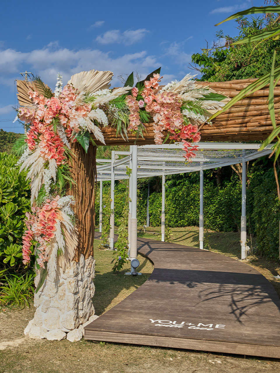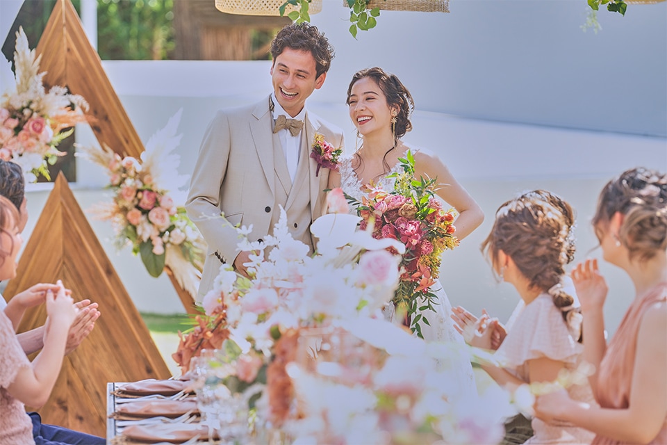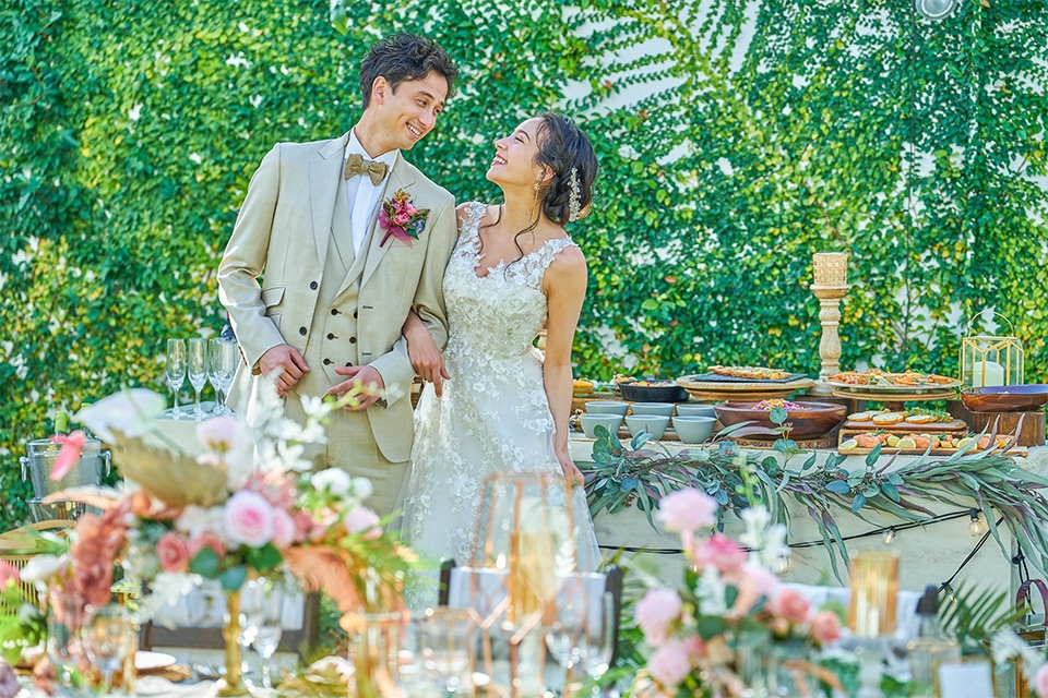 オーシャンビューで緑あふれるガーデンでゲストをお迎えするウエルカムパーティー。自然の光や風、緑が響きあうオーシャンガーデンで最高のひとときを楽しんで。