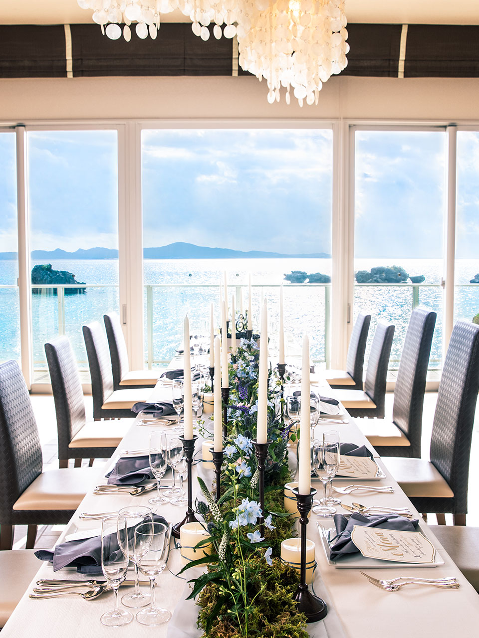 シンプルでモダンな空間のオーシャンフロントバンケット。沖縄の美しい海でとれた新鮮な海の幸やお野菜を使った目にも美しい創作フレンチをゲストの皆様と堪能して。