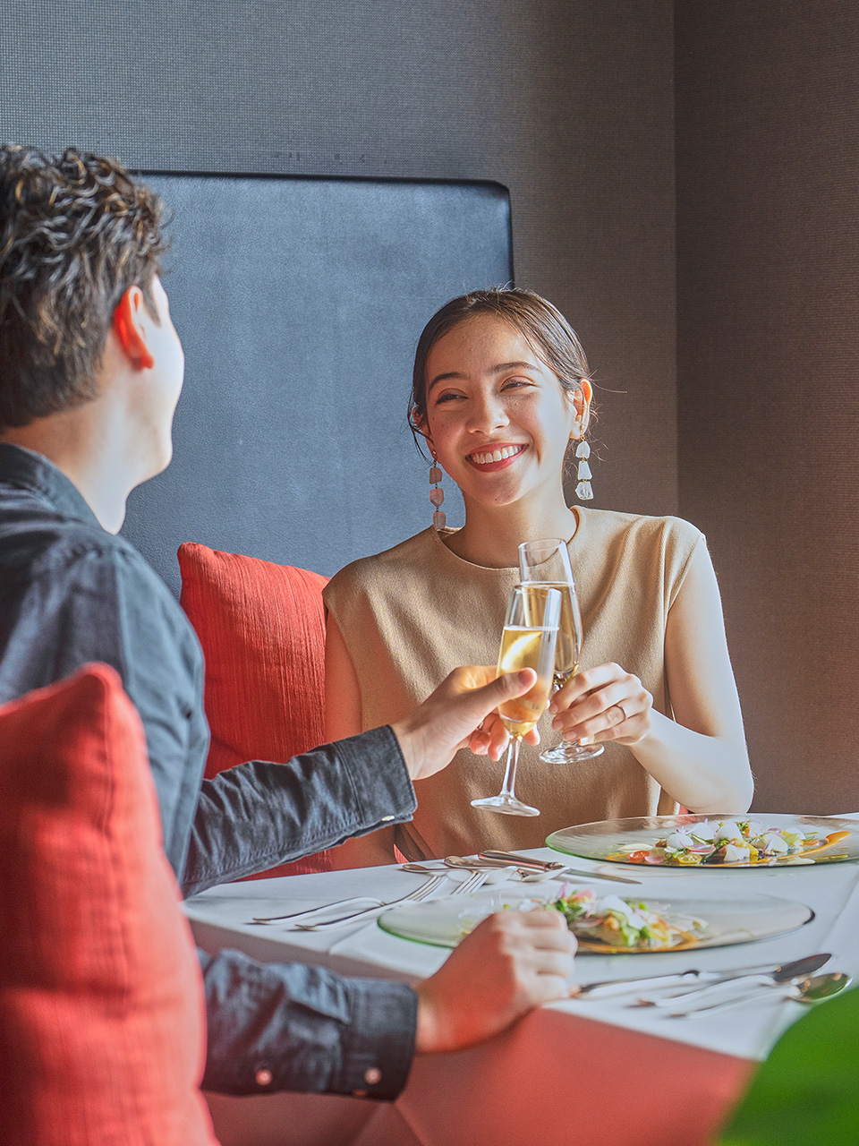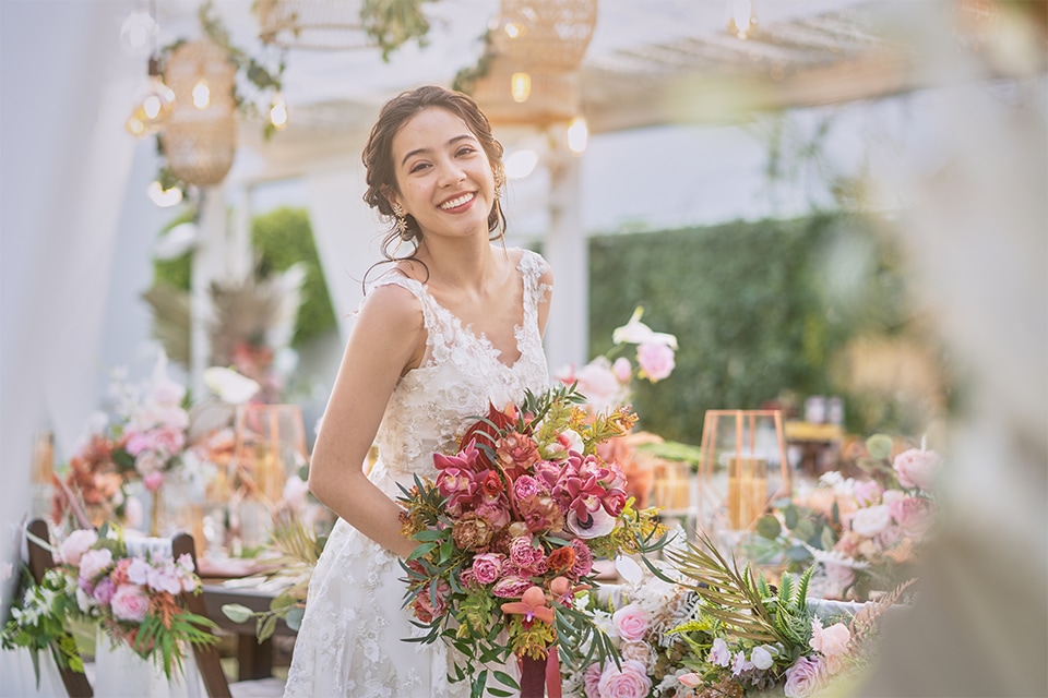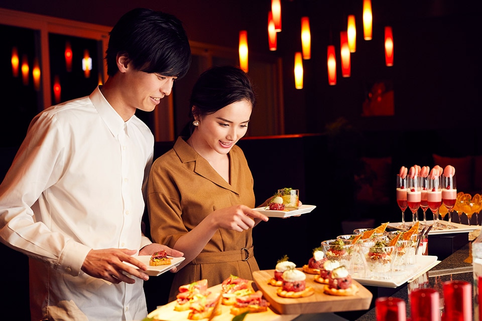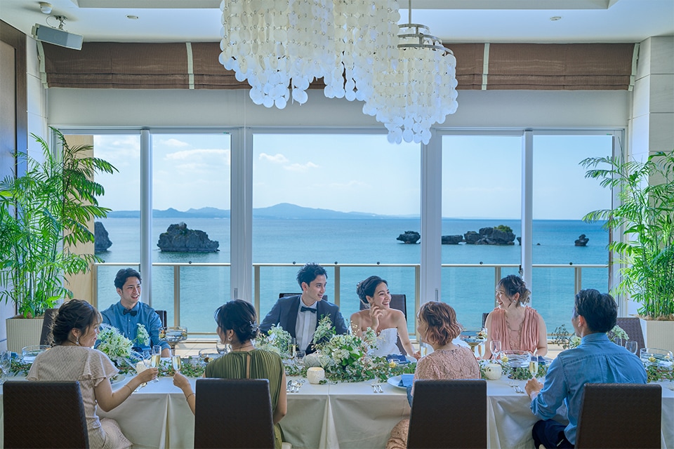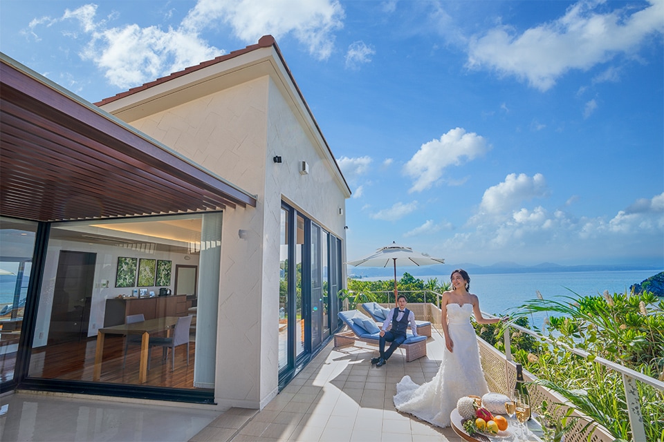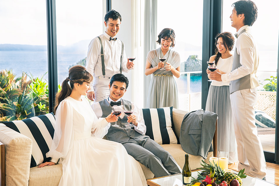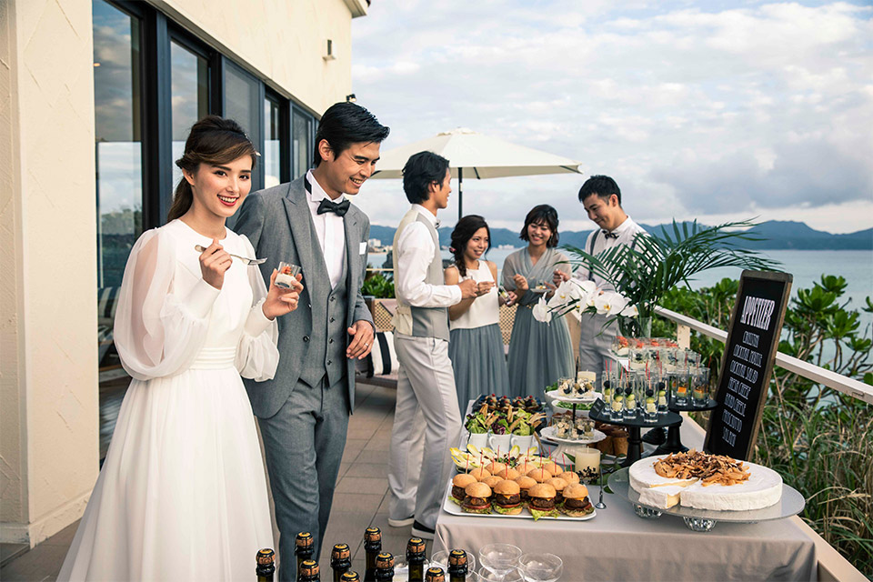 独立したリビングを持つエグゼクティブスイートに宿泊するおふたりは、ヴィラでのアフターパーティー。バルコニーからは名護湾のパノラマビューを見渡せるプライベートな空間でゲストたちと楽しめます。