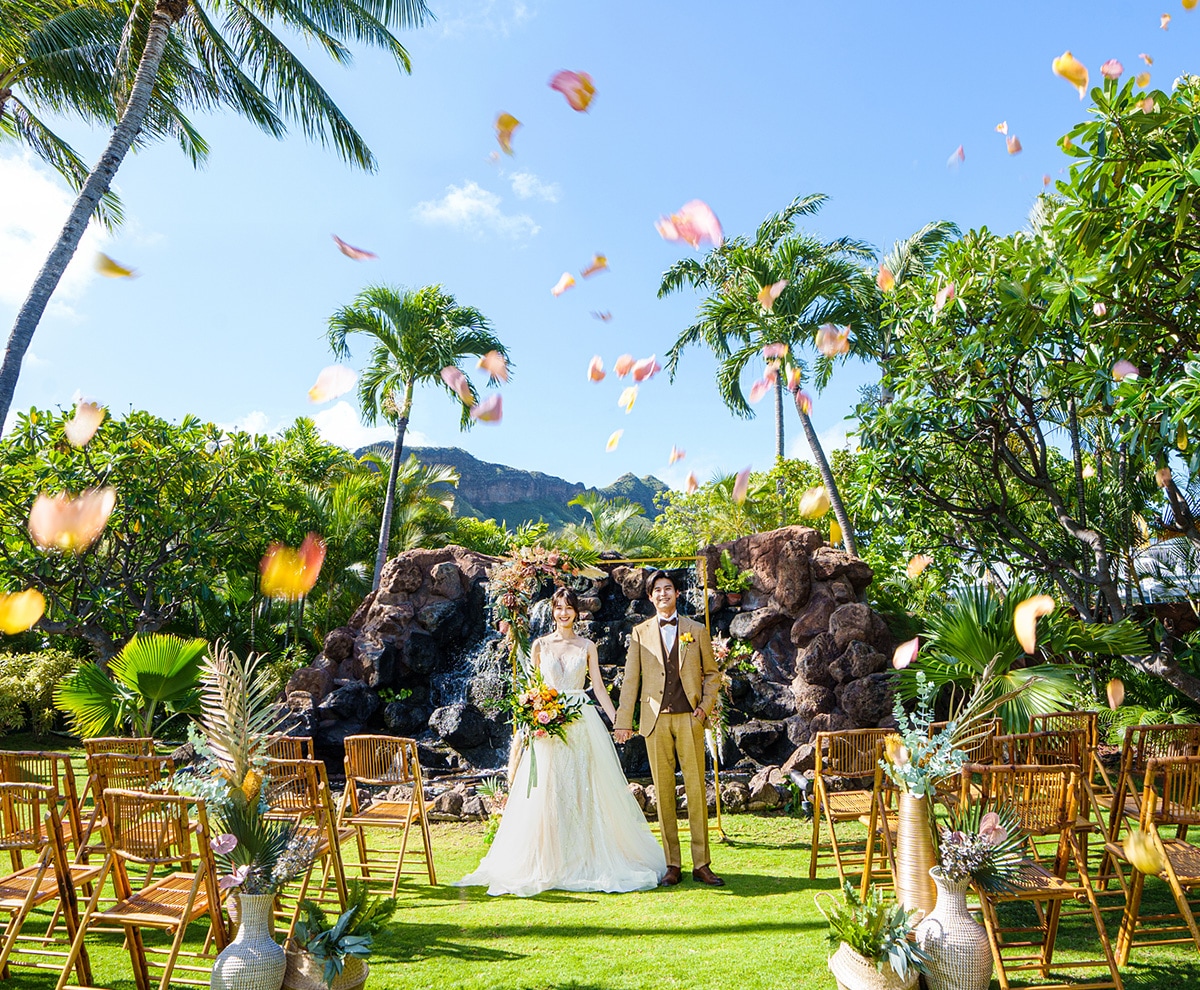 お父様はモーニング、お母様はワンピースという衣裳はもちろん、リゾートだからこそ可能な「アロハシャツ&ムームー」で皆お揃いの柄・色を揃えたり、民族衣裳を着られる方も!集合写真はゲストの方の服装でも印象が変わりますので、華やかさがプラスされて記憶に残る挙式になる事間違いなしです。