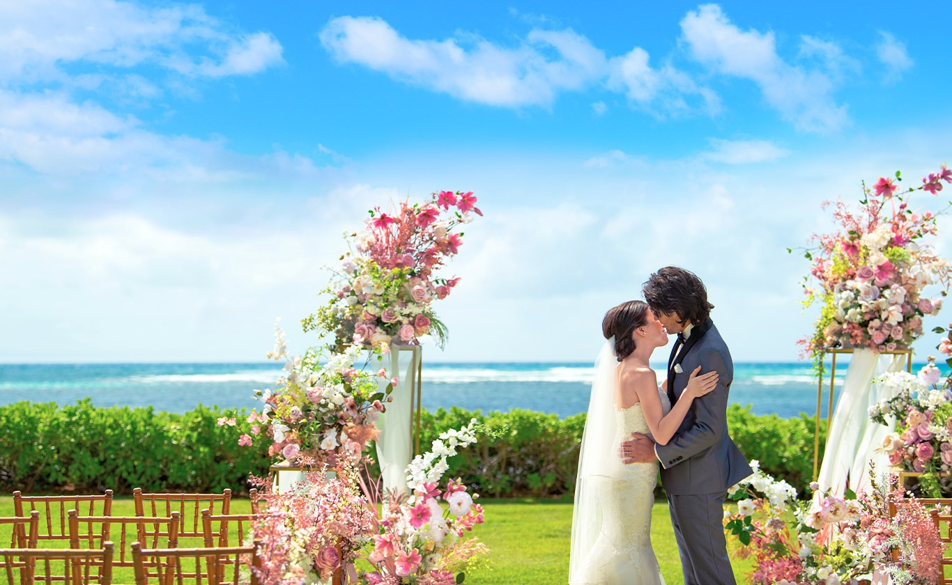 その広大な敷地内のエメラルドグリーンに輝くビーチフロントで行う、ガーデンウエディング。