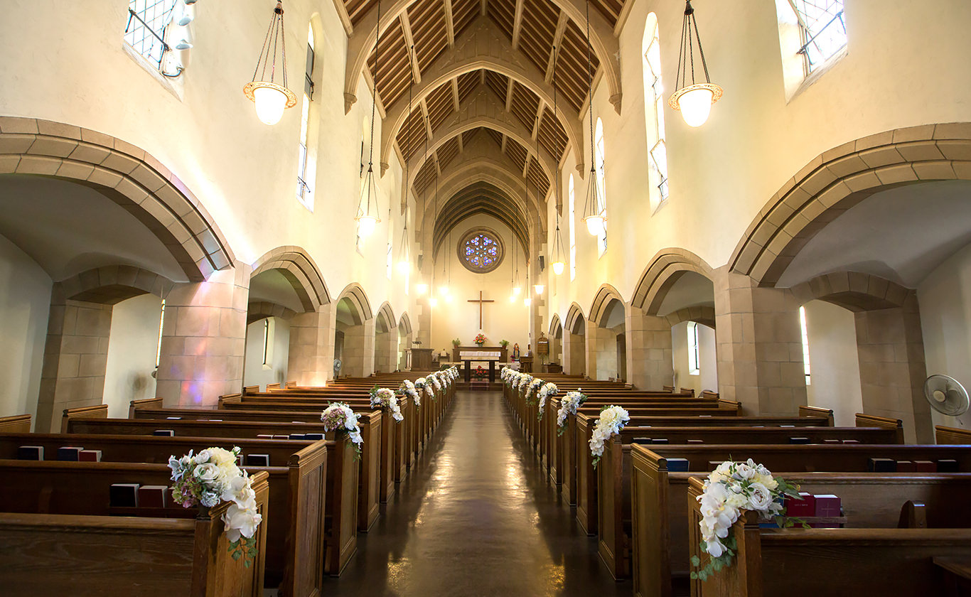 アーチ型の高い天井の下に伸びる長いバージンロード。