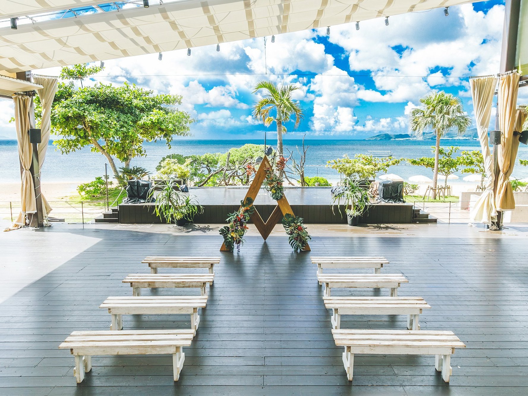 フサキビーチに面した屋外デッキ「カーチバイ」が、新たなウエディング会場として登場しました。目の前に広がる青い海と空に包まれた特別なロケーションで、心に残るセレモニーを。
