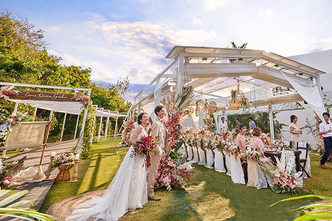 ハイビスカスやブーゲンビリア、椰子の木やモモタマナの木など、沖縄の離島ならではの自然を感じる、八重山方言で「美しい羽」を意味する「アヤパニ」と名付けられた広大なフサキガーデンでウエディング。