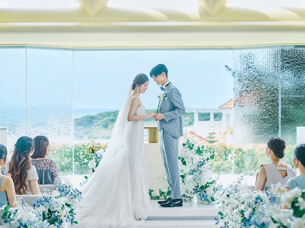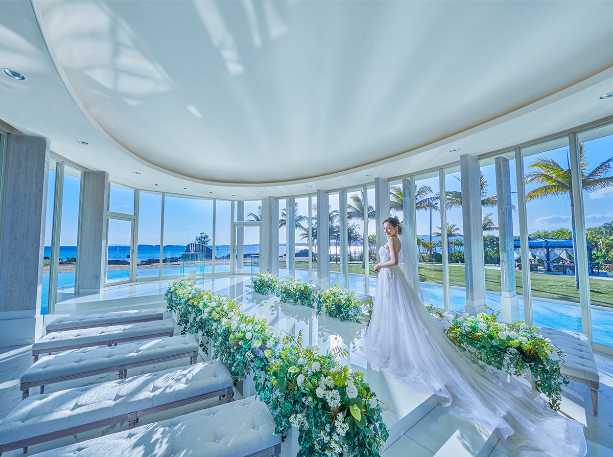 カヌチャリゾート内。ガラスの祭壇越しに広がるカヌチャブルーが、海と空の一体感を生む絶景チャペル。サンセットも人気。