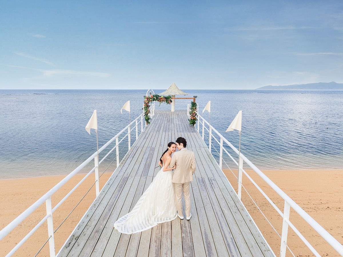 白い桟橋の先、海の上で誓うような開放的セレモニー。足元にコバルトブルーの海、風と光が祝福する特別な時間を過ごせます。