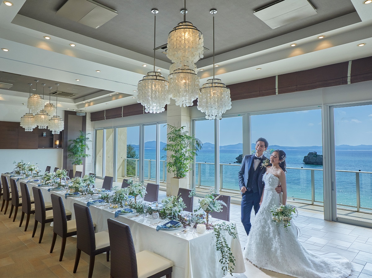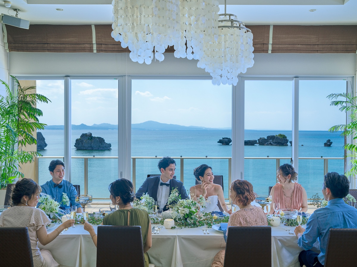 挙式後は海を眺めながら、ゆったり祝宴へ。慌ただしい進行より、景色と美食と会話を楽しむ時間が主役——沖縄ならではの披露宴です。