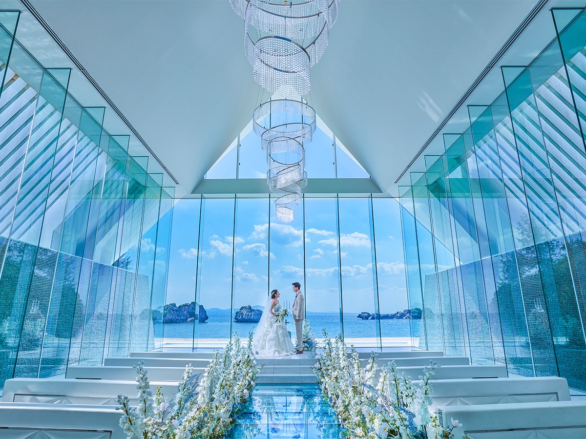 宮古島ブルーを一望できるガラス張りのチャペル。光を受けてきらめく祭壇と、穏やかな時間が流れる滞在型リゾートが魅力。
