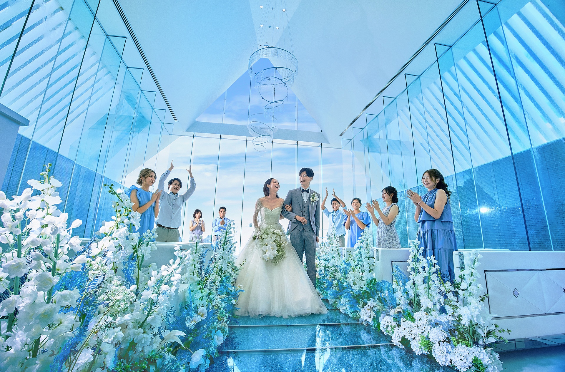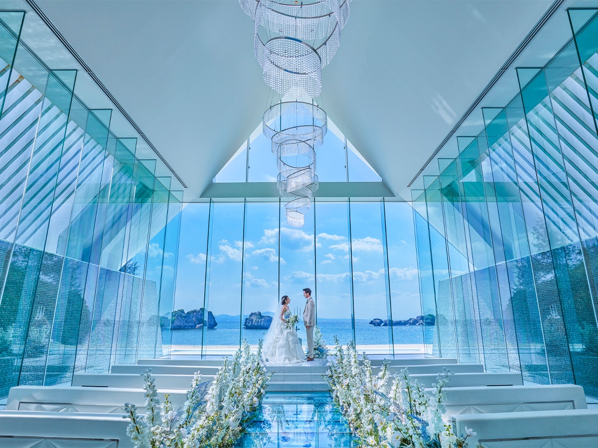 2025年春にグランドオープンした、宮古ブルーを一望できるガラス張りのチャペル。光を受けてきらめく祭壇と、穏やかな時間が流れる滞在型リゾートが魅力。