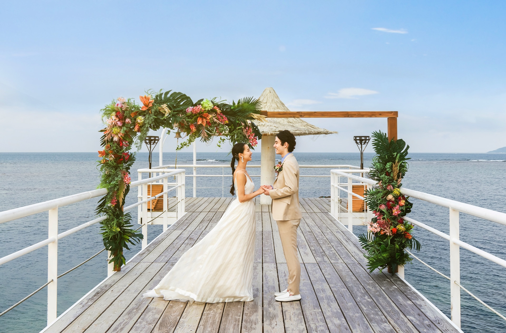 白い桟橋の先、海の上で誓うような開放的セレモニー。足元にコバルトブルーの海、風と光が祝福する特別な時間を過ごせます。