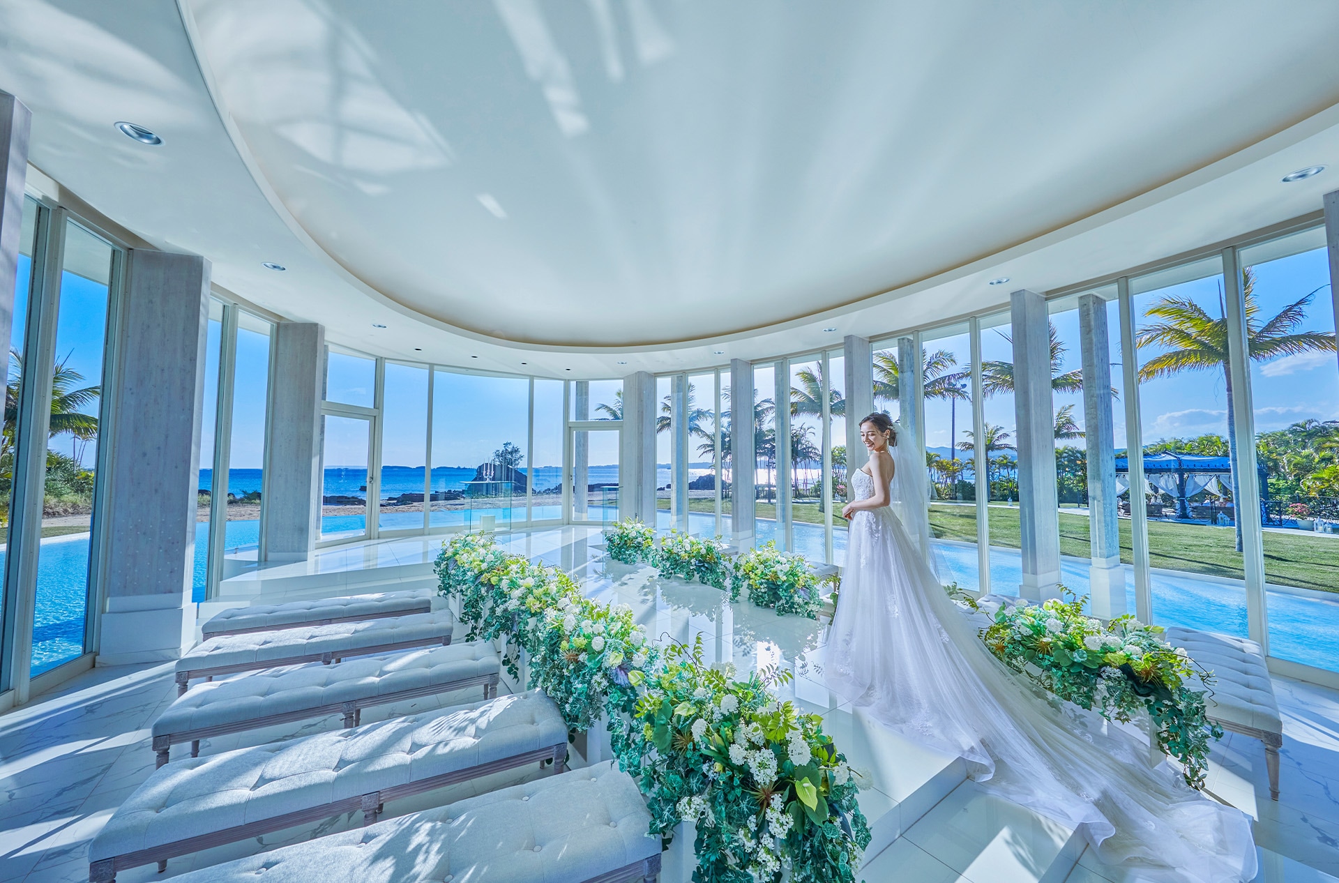 沖縄本島北部の広大なカヌチャリゾートに佇む「アイネス ヴィラノッツェ in カヌチャベイ グラン・ブルーチャペル」は、360度ガラス張りの開放感あふれるチャペルが魅力。澄み渡る海を望む絶景の中で、リゾート感あふれる挙式が叶います。
