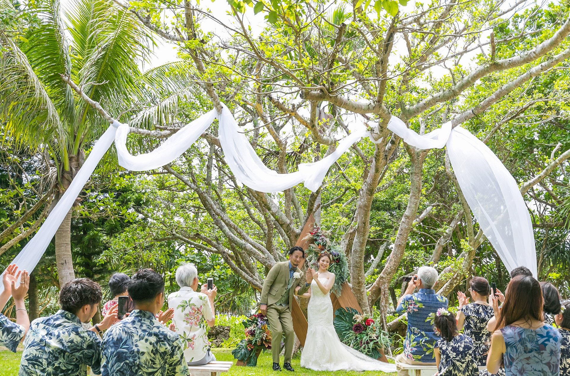 「ガジュマルの木に囲まれた挙式は、自然と一体になれるような特別な空間でした。木漏れ日が差し込む中、緑に包まれた時間が心地よく、料理も沖縄らしい華やかさで大満足。少人数でも温かく、おもてなしを感じられる式になりました。」
