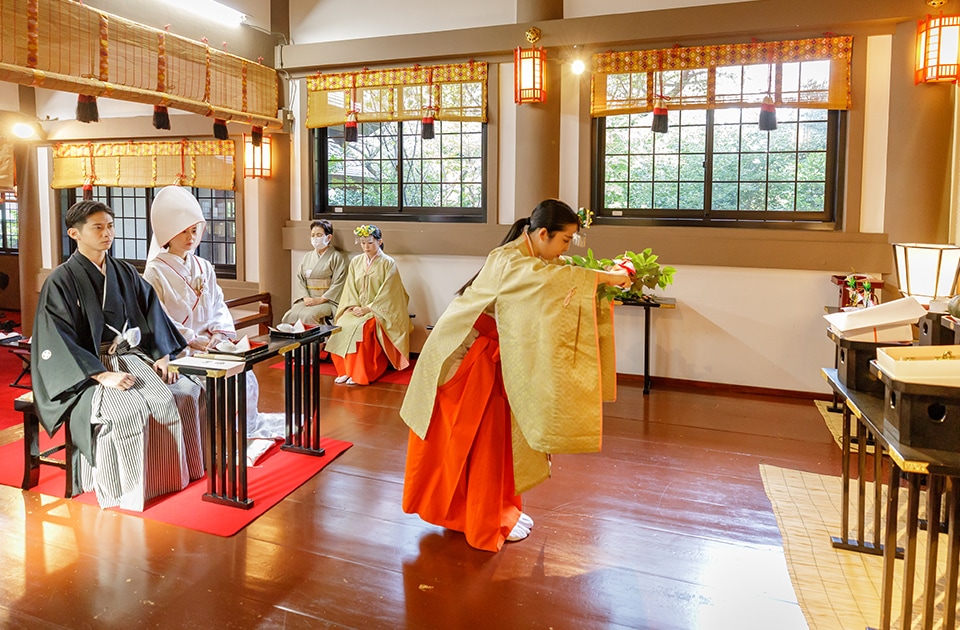 天照皇大御神を御奉齋する社を神明社といい、当官もその神明社のひとつです。 天照皇大御神の「神明かり」の中で厳粛なご婚儀を斎行いたします。