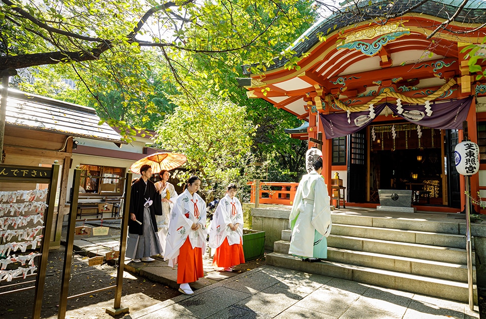境内には徳川家光公お手植えの大公孫樹、桜、梅、楓など四季折々に目を楽しませてくれる美しい風景があります。都心にありながら、喧噪を離れ、おふたりの幸せをいのりおごそかに挙式が執り行われます。