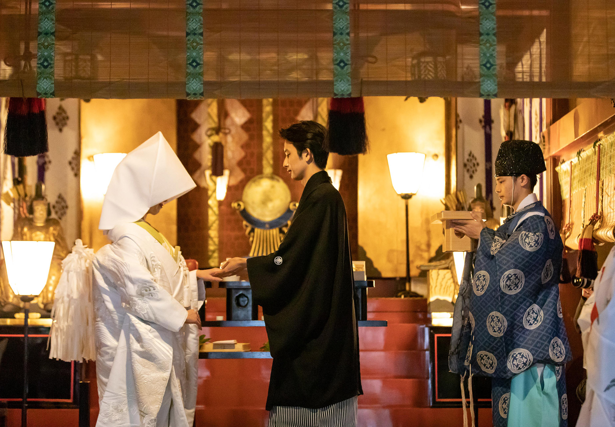 厳粛な空気が流れる中、夫婦の契りを交わす。
